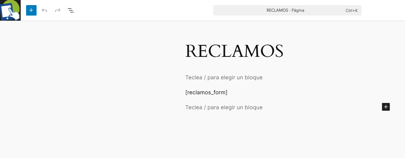 Luego de creada la pagina ingrese al cuerpo y tipee o pege el texto [reclamos_form]