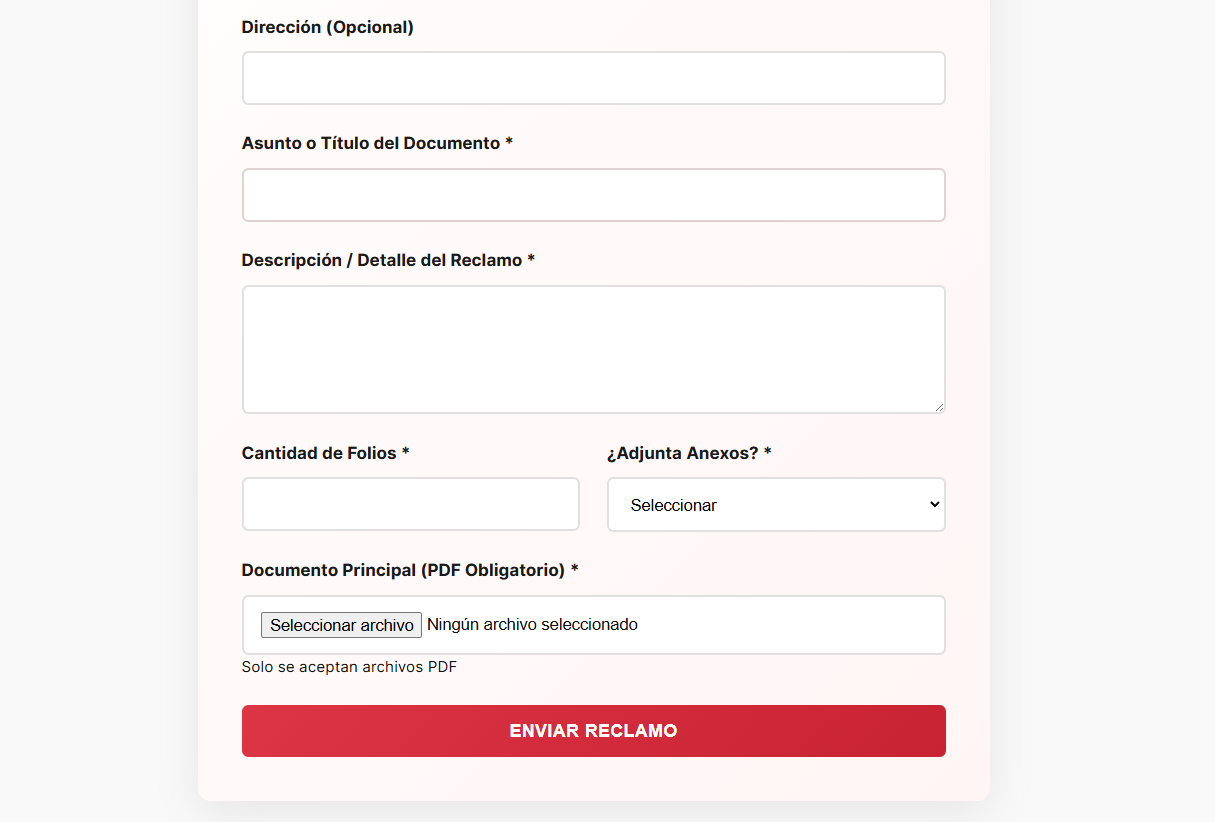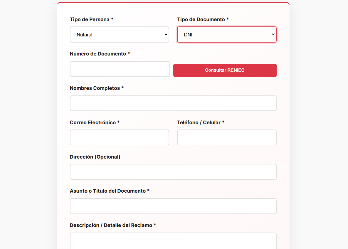 El formulario tiene validación RENIEC cuando se selecciona en tipo de documento DNI y tiene validación SUANT cuando el tipo de documento es RUC, además podrá adjuntar una archivo PDF obligatorio como principal y imágenes u otros archivos como anexos.