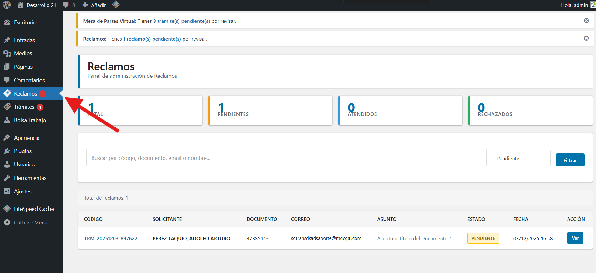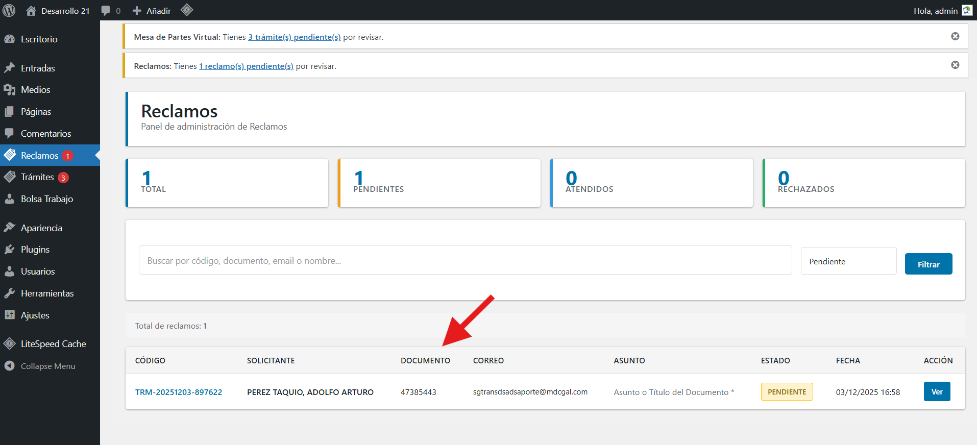 Cada vez que se registra un documento nuevo en el sistema, este se crea con el estado PENDIENTE, la cantidad de documentos pendientes se muestra como alerta en el Menu Trámites