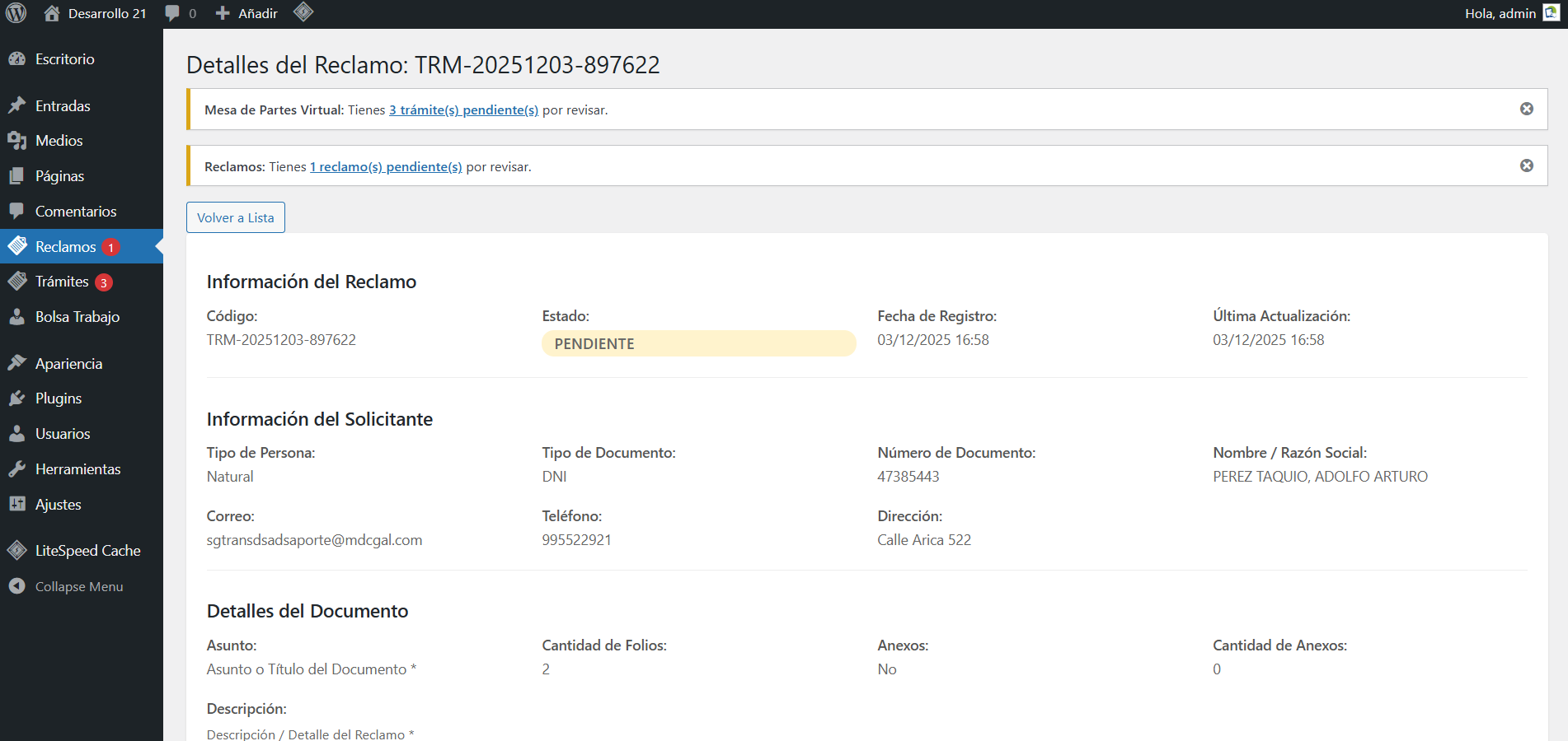 Primero puede ver el resumen de lo que reclamo la persona