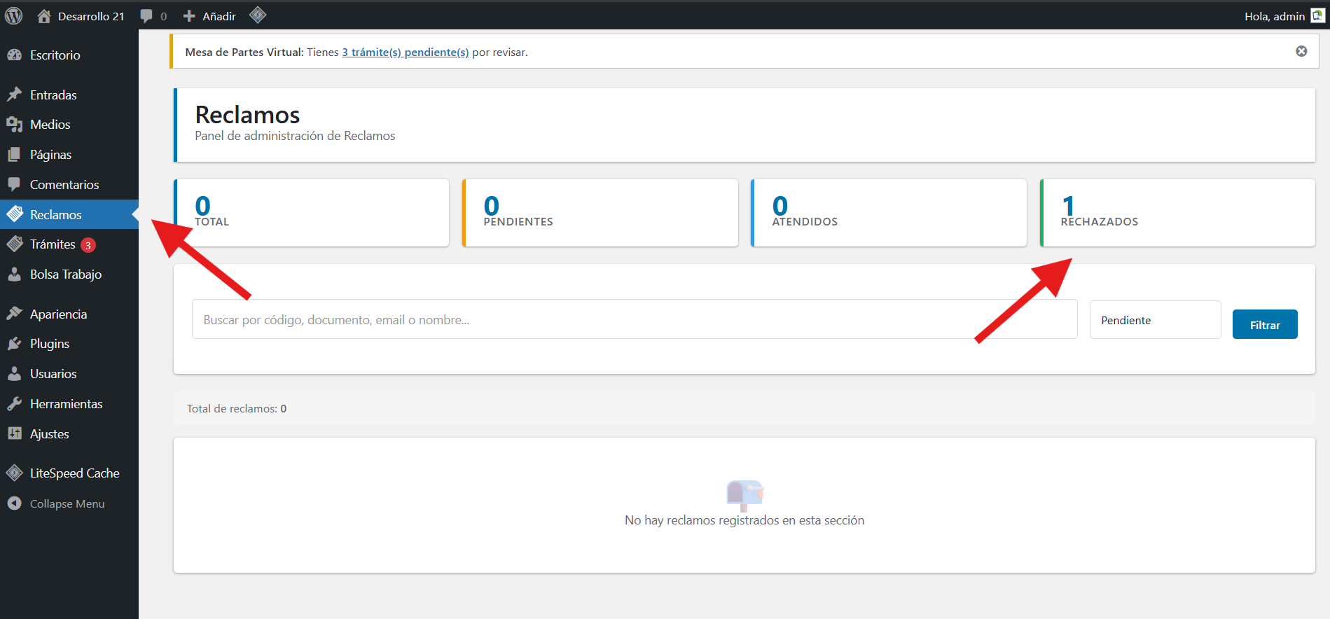 Cuando ingrese al menú trámites vera un dashboard que resume cuantos documentos pendientes, atendidos o rechazados