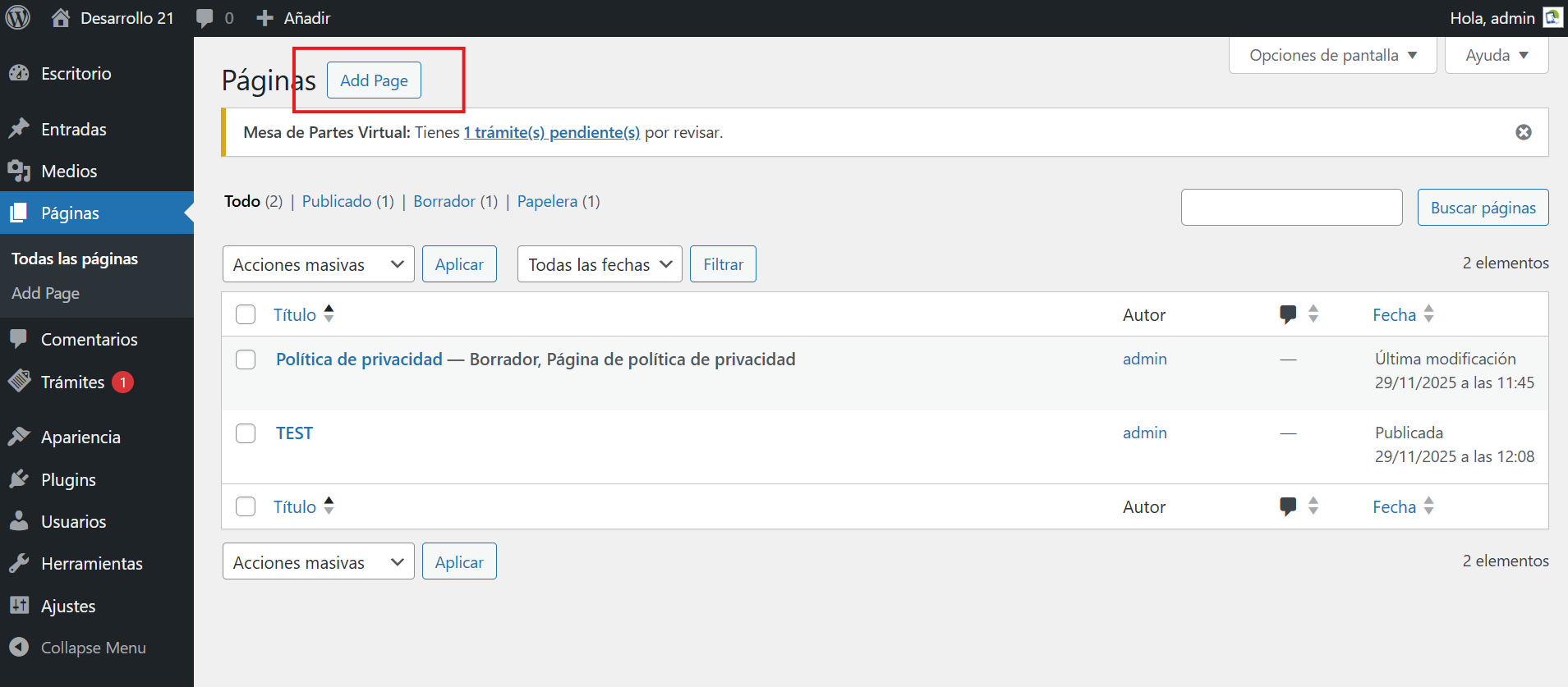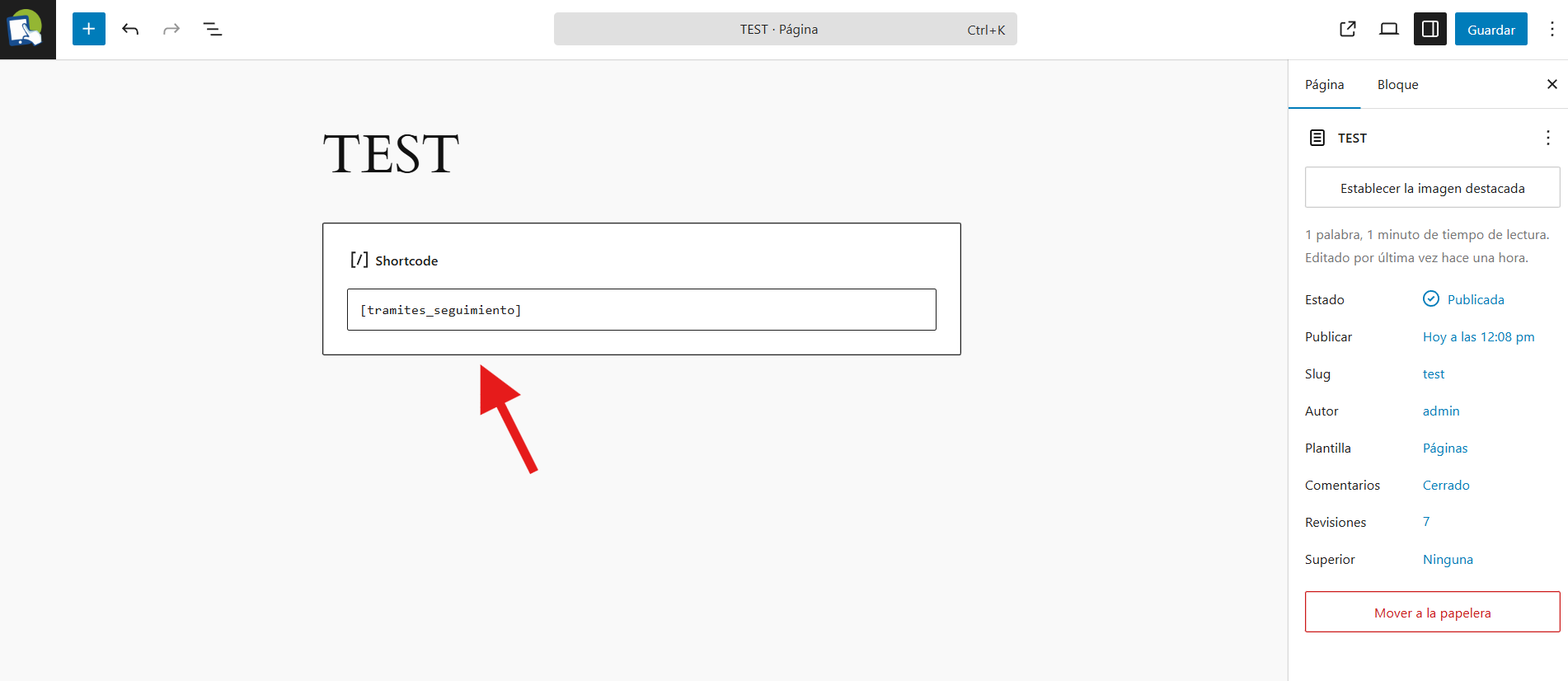 Luego de creada la pagina ingrese al cuerpo y tipee o pege el texto [tramites_seguimiento]