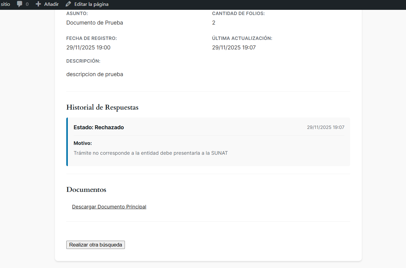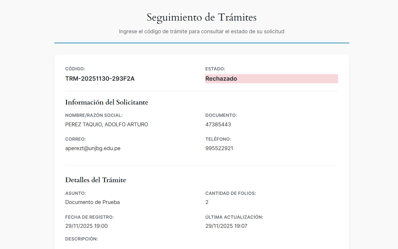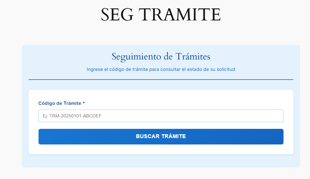 Ingresamos un código para dar seguimiento y luego click en BUSCAR TRAMITE
