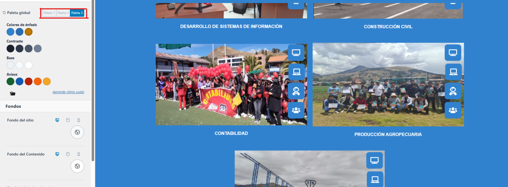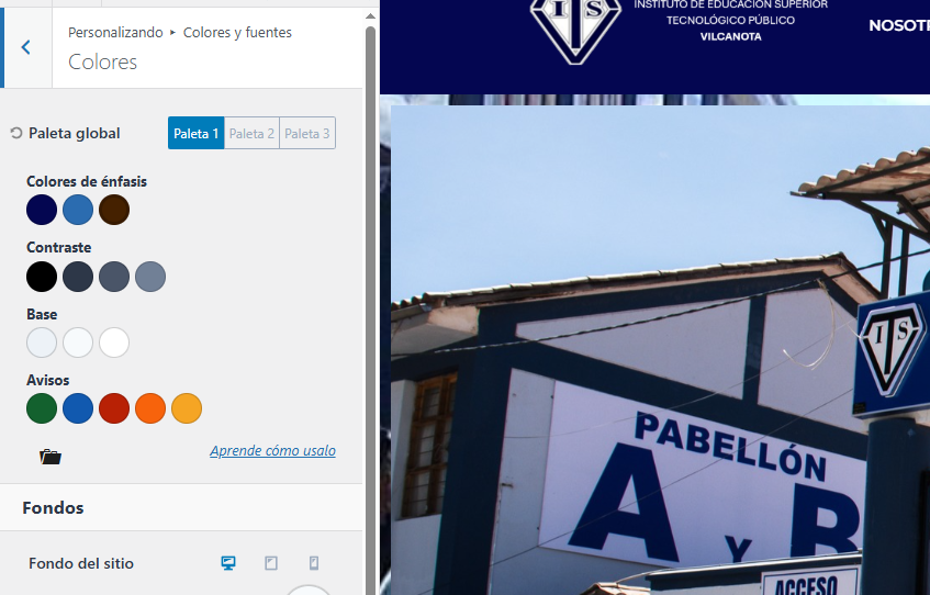 Paso 5: Podemos seleccionar 3 Paletas globales donde puedes cambiar el color de énfasis, contraste,Base y Avisos o bien escoger el color que sea de su agrado