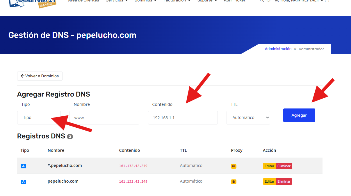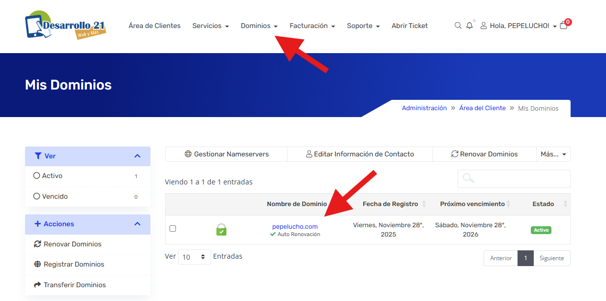 Primero nos dirigimos a la sección Dominios y elegimos el dominio a administrar