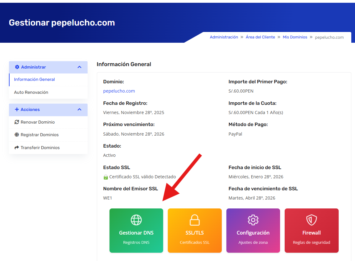 Encontraremos lo siguientes datos informativos y la opción de gestionar DNS