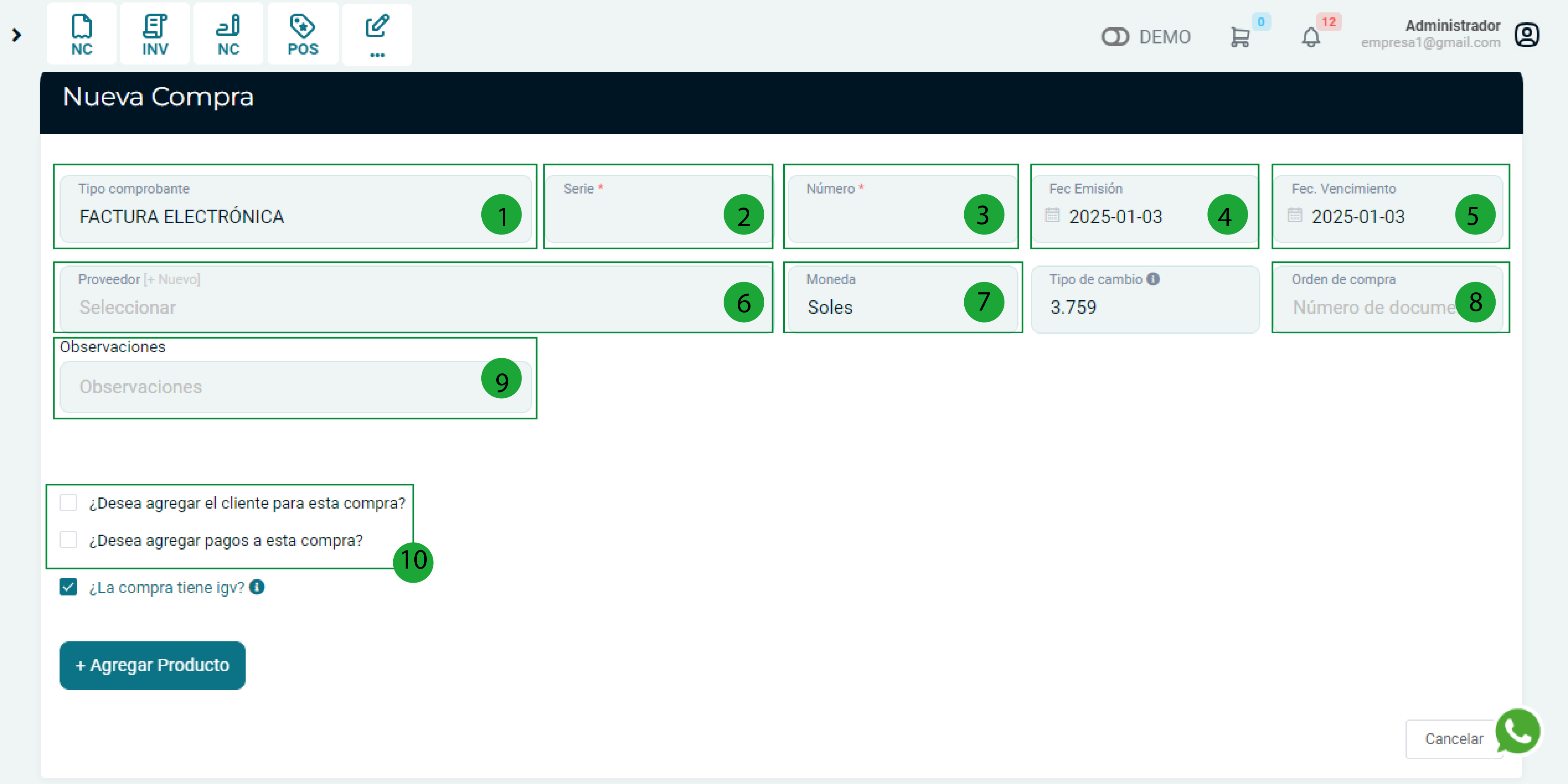 - ¿Desea agregar pagos a esta compra?: Al seleccionar esta opción, detallaras las condiciones de pago del comprobante.