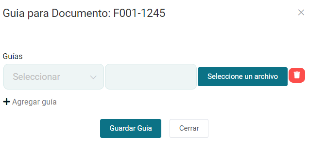 - Guía: Podrá registrar la guía de remisión que le brindo su proveedor, también puede subir la guía de remisión. Seleccionando el botón Seleccione un archivo.