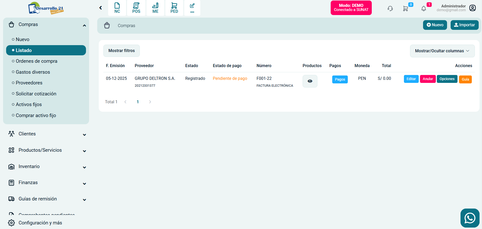 Ingresa al módulo de Compras y luego selecciona subcategoría Listado.