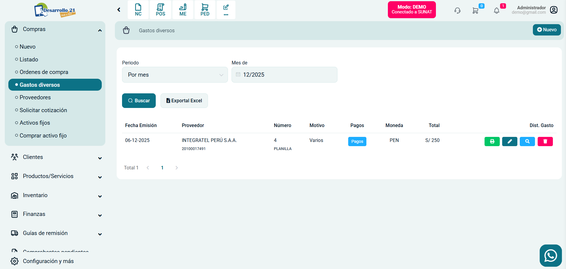 Ingresa al módulo de Compras y luego selecciona la subcategoría Gastos diversos. En la parte superior derecha selecciona el botón Nuevo.