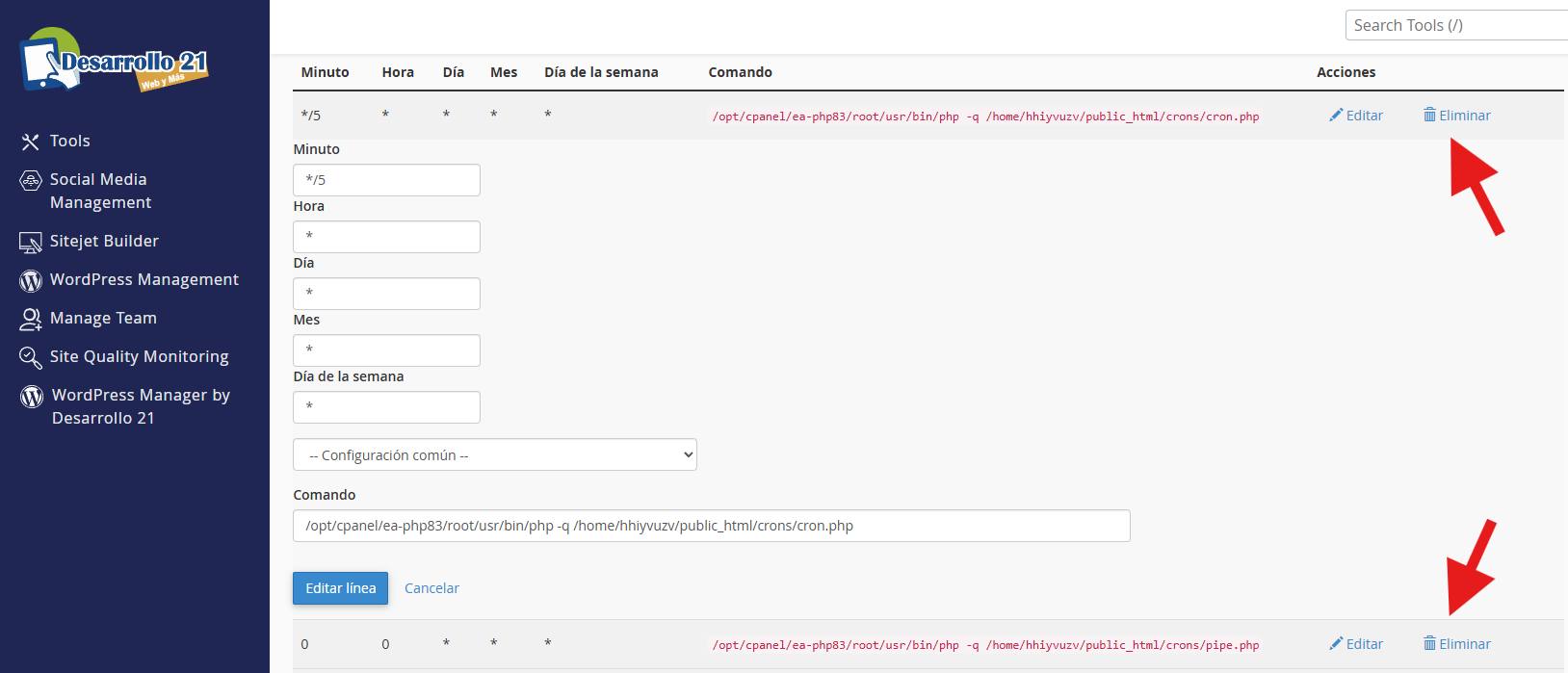1. Bajo Tareas programadas actuales, encuentra tu cronjob y haz clic en Eliminar.