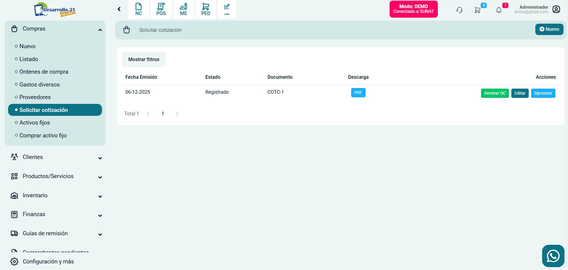 - Generar OC: Permite generar una orden de compra a partir de la cotización seleccionada.
