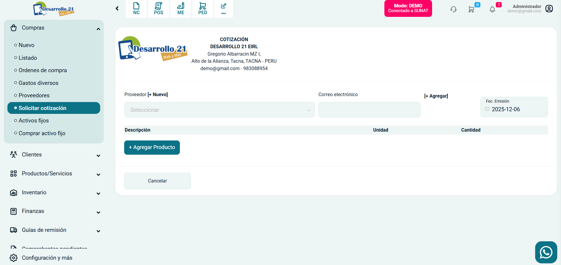 En esta área te ayudaremos a solicitar una cotización a tus proveedores. Sigue estos pasos para realizarlo: