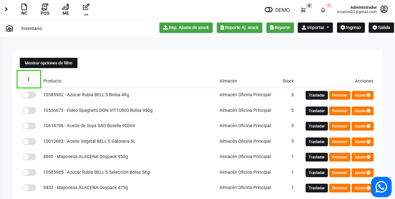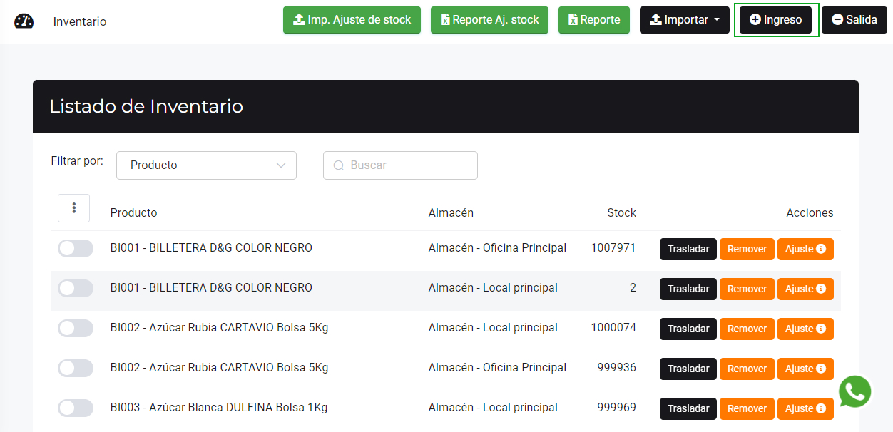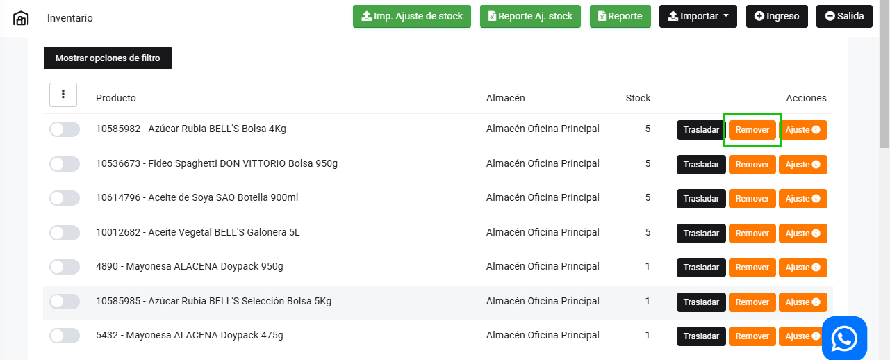Este botón te ayuda a importar masivamente el ajuste de stock.