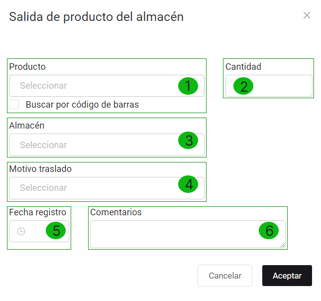 - Producto (*): Selecciona el producto que desea registrar salida.