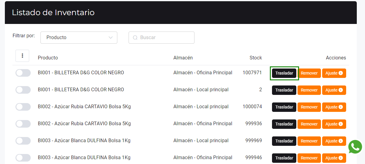 - Cantidad a trasladar: Ingresa la cantidad de producto que desea trasladar al otro almacén.