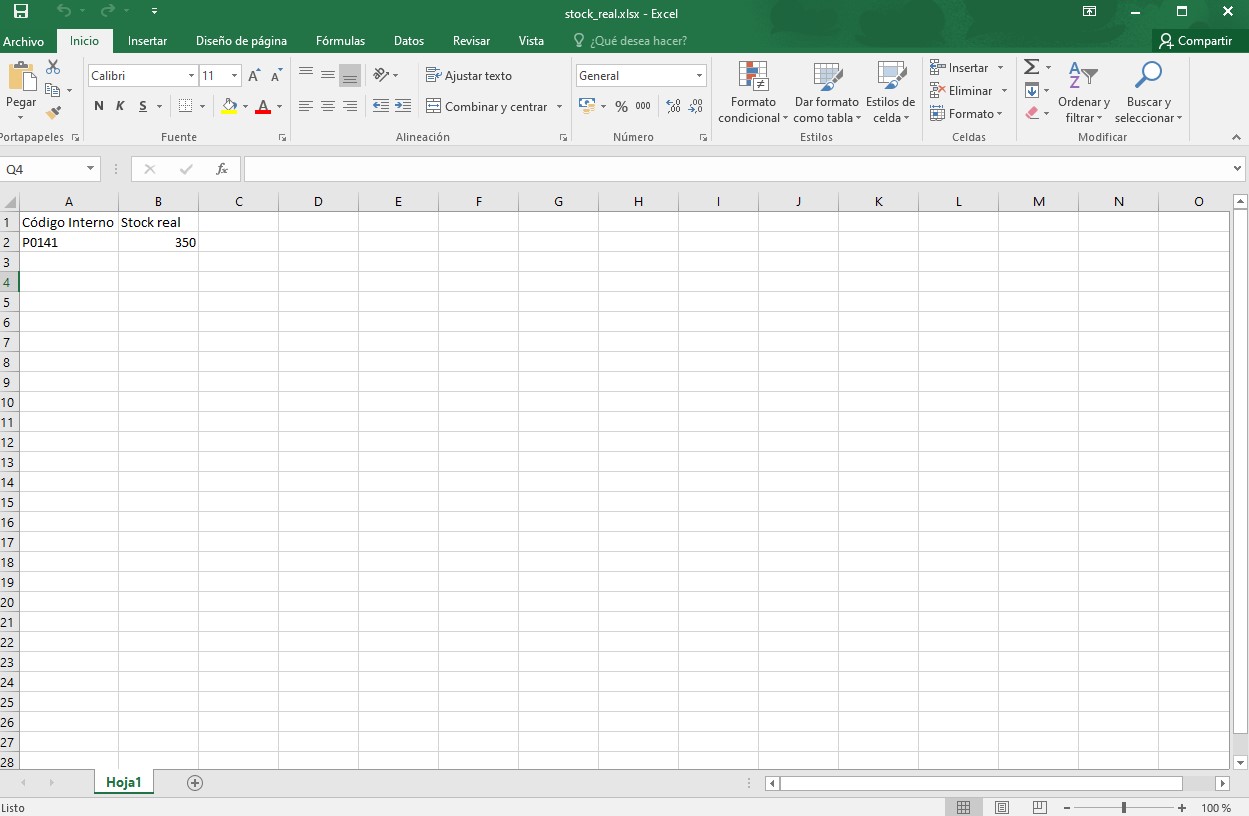 Primero selecciona el almacén en el que se modificará el stock. Después selecciona el botón Descargar formato de ejemplo para importar , se descargará un archivo excel.