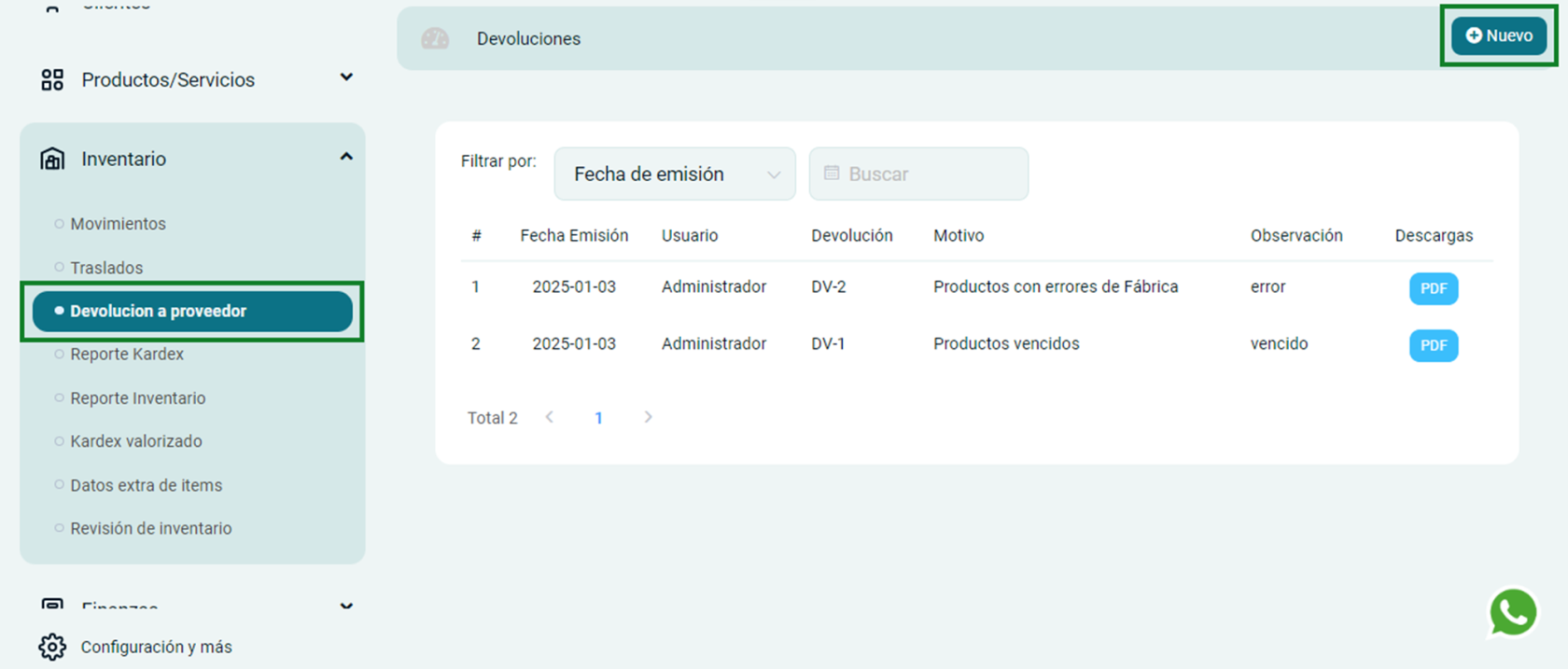 Ingresa al módulo de Inventario, luego selecciona la subcategoría Devolución a proveedor. En la parte superior derecha selecciona el botón Nuevo.