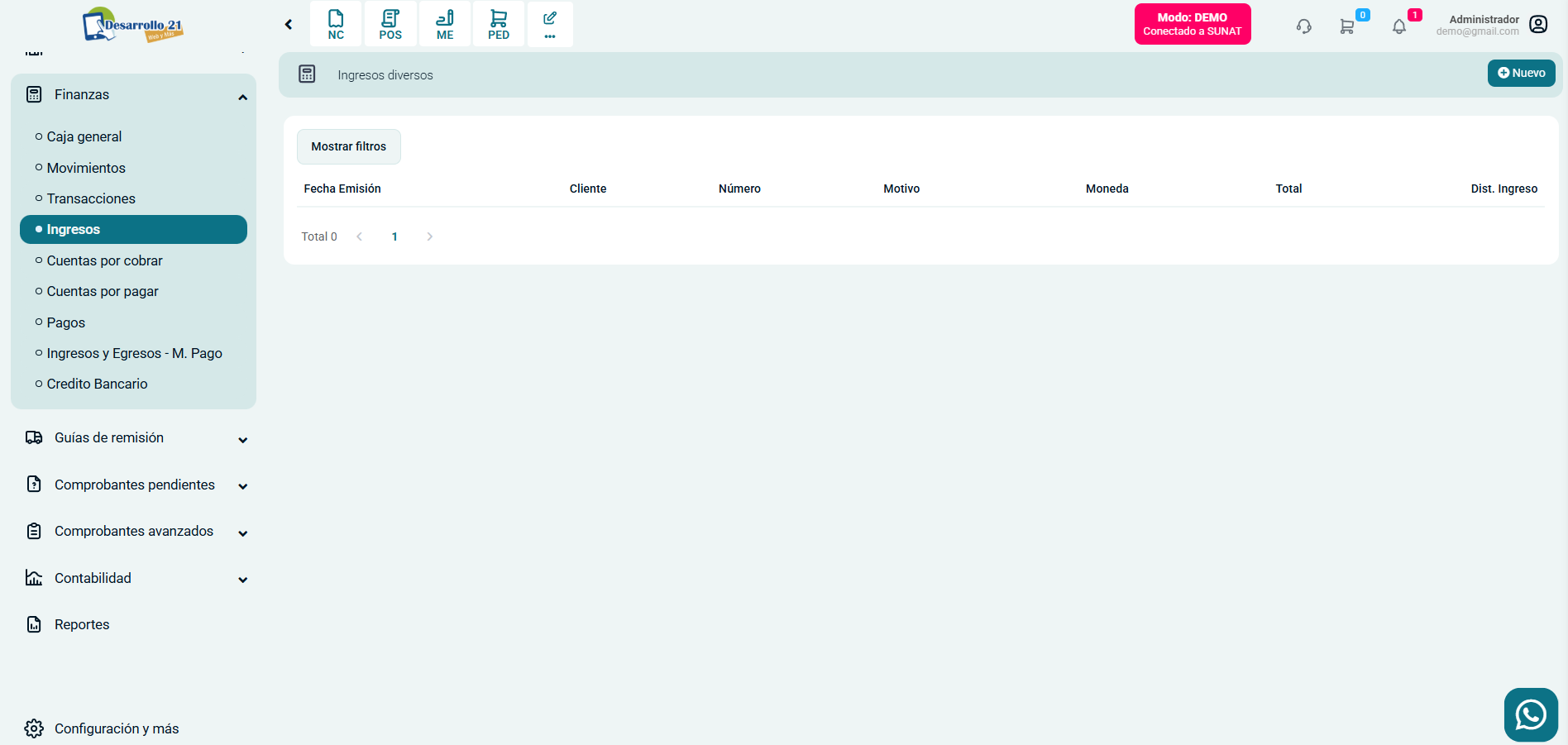 Ingresa al módulo de Finanzas y luego selecciona la subcategoría Ingresos.