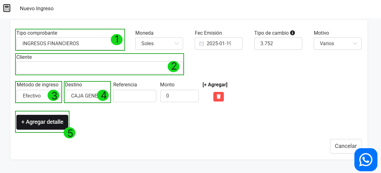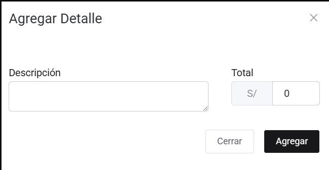 - 5. Agregar detalle: Selecciona el botón Agregar detalle, aparecerá la siguiente ventana emergente.