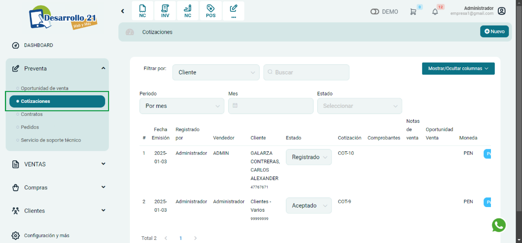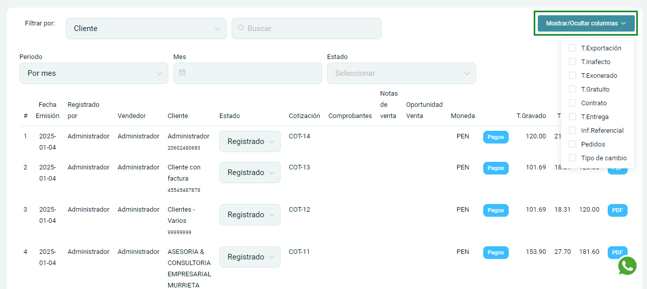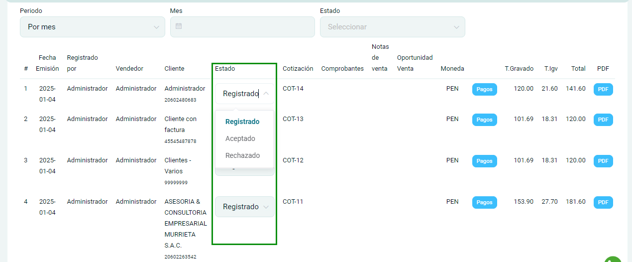 Para tener un orden con todas las cotizaciones generadas. Se puede seleccionar: