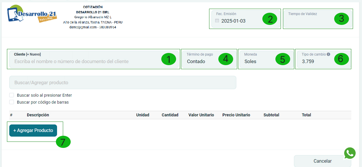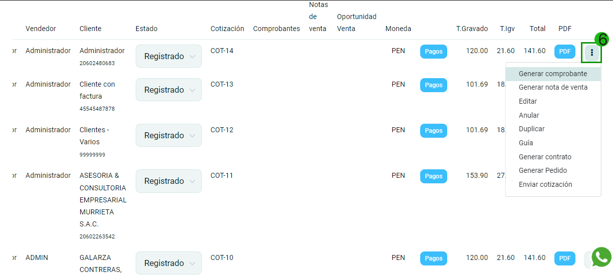 En esta área podrás generar comprobantes de cotizaciones.Sigue estos pasos para realizarlo: