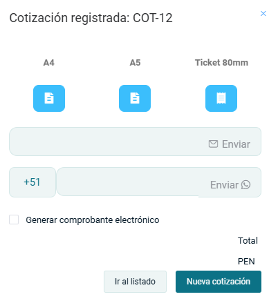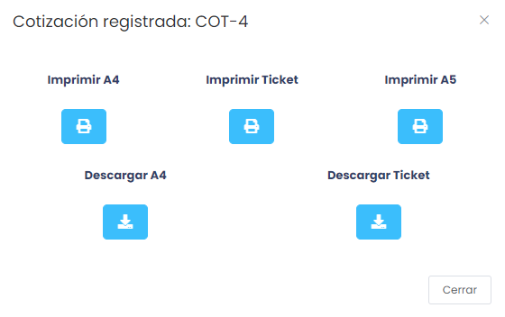 5. PDF En esta sección podrás reimprimir la cotización, de la misma manera podrá descargar la cotización. Además podrás escoger el formato de la cotización en tamaño A4(vertical), 80MM (ticket) y A5(horizontal).