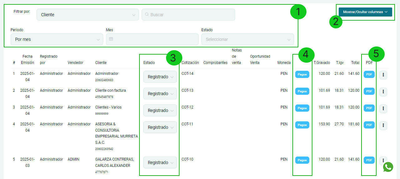 1. Filtros de búsqueda: En esta área podrá buscar una cotización específica.
