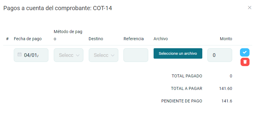 4. Pagos Al seleccionar el botón aparecerá una ventana para añadir un pago a la cotización realizada.